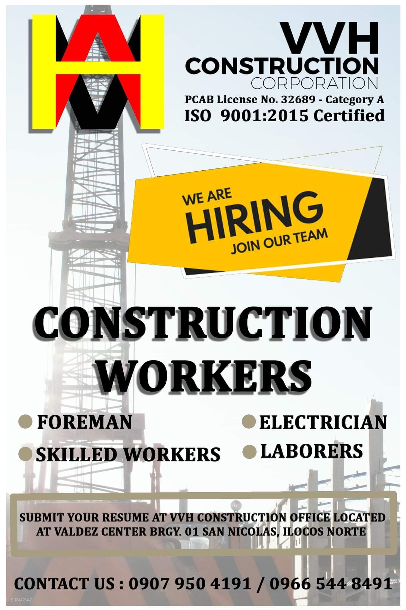 Submit your resume at VVH Construction Office located at Valdez Center Brgy. 01 San Nicolas, Ilocos Norte.